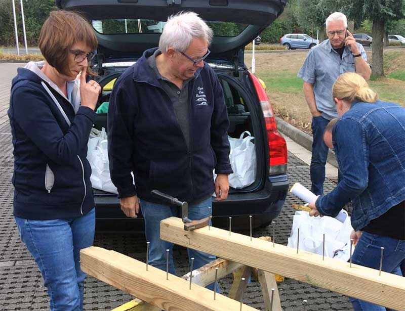 Nach dem Frühstück ging der erste Teilnehmer um 10 Uhr auf die Strecke. Der Start erfolgte im Zwei-Minuten-Abstand nach Durchführung der ersten „Hammer“-Aufgabe. Hier war weit vorn, wer mit einem „geknickten“ Hammer einen Nagel möglichst weit in ein Brett treiben konnte. Das winklige Schlagwerkzeug knallte übrigens mehr als einmal ohne Berührung des Nagels auf das Holz.