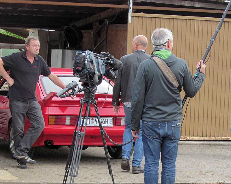 Rund eine Woche später trafen wir uns alle zum zweiten Drehtag, wo zunächst die bereits erwähnten Interviews auf dem Programm standen. Dabei wurden wir selbstverständlich auch danach gefragt, wie es denn mit der Harmonie zwischen den beiden Fraktionen Opel und Ford stehe. Wahrheitsgemäß konnten wir unter anderem berichten, dass ich mit meiner Frau, Mitglied der Alt-Opel-IG, schon mehrfach mit großem Spaß die Jahrestreffen der AOIG erlebt habe und sie mich mit ebenso großem Vergnügen bei diversen Capri-Aktivitäten begleitet.