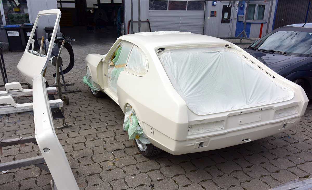 Im folgenden Herbst habe ich mich dann mit der Karosserie beschäftigt. Nach drei Besuchen bei dem Lackierer meines Vertrauens musste ich erfahren, dass er das nicht machen will. Ihm war es zu riskant, an diesem Wagen Hand anzulegen. Was nun? Es gibt in Neu-Ulm die Oldtimerfabrik, dort wird auch immer mein Triumph gepflegt. Ich habe Kontakt aufgenommen und ich bin mit dem Capri dorthin gefahren. Nach der Besichtigung des Autos in Neu-Ulm hat mich zu Hause der Anruf ereilt, sie müssen sofort in Munderkingen anrufen, der Lackierer wartet auf ihren Anruf. Zwei Tage später war ich dort, der Lackierer ist ein echter Ford-Fan. Nach drei Stunden waren wir handelseinig.