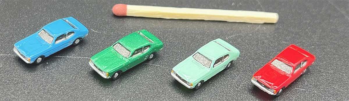 Die kleinsten Capri in Thomas` Sammlung. Eine Auswahl im Maßstab circa 1:180 des Herstellers mbw. Die Modelle sind gedacht als Zubehör für Modelleisenbahnanlagen oder Miniaturlandschaften.