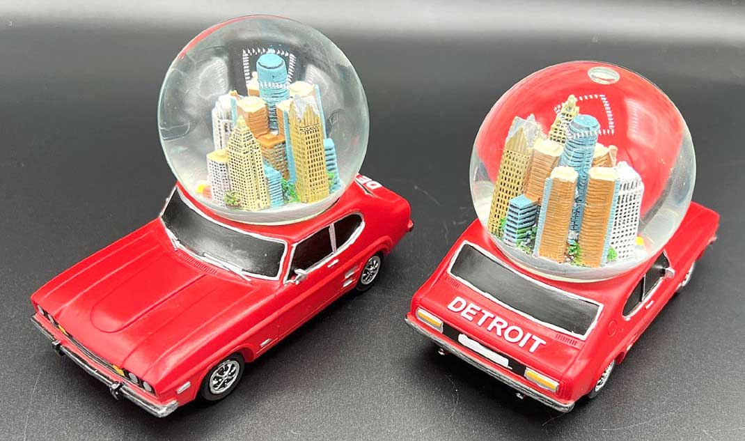 Kurioses Modell im Maßstab circa 1:24, als Werbemodell für die Stadt Detroit, mit einer Schneekugel auf dem Dach. Ein Capri als Werbeträger für die Motor City Detroit.
